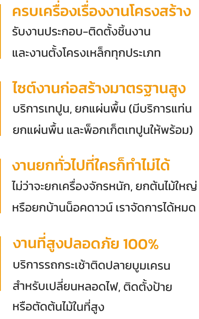 เราเน้นบริการ "โทรปุ๊บ ได้ปั๊บ" ด้วยจำนวนรถที่ครอบคลุมตั้งแต่ 10-150 ตัน พร้อมแสตนบายตลอด 24 ชั่วโมง